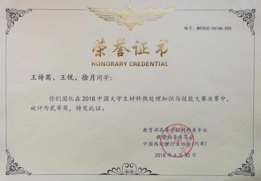 日前,2018中国大学生材料热处理知识与技能大赛落下帷幕。本届大赛由中国热处理行业协会、教育部高等学校材料类专业教学指导委员会主办,中国热处理行业协会教育培训工作委员会、哈尔滨工业大学、河北工业大学、福州大学、西南交通大学共同承办。sunbet申搏材料科学与工程学院王诗茜、王悦、徐月、刘东静、段东芳和李芮6名学生分成2队参加比赛,分别荣获二等奖和优秀奖,材料化学专业副教授由园博士被评为优秀指导教师。