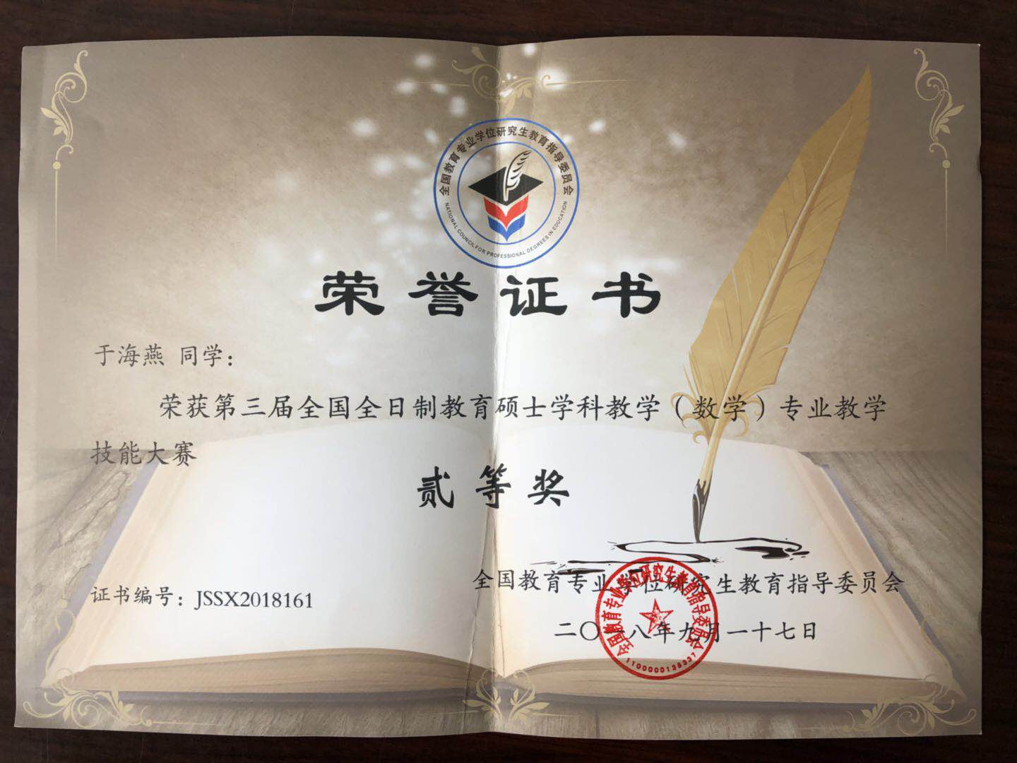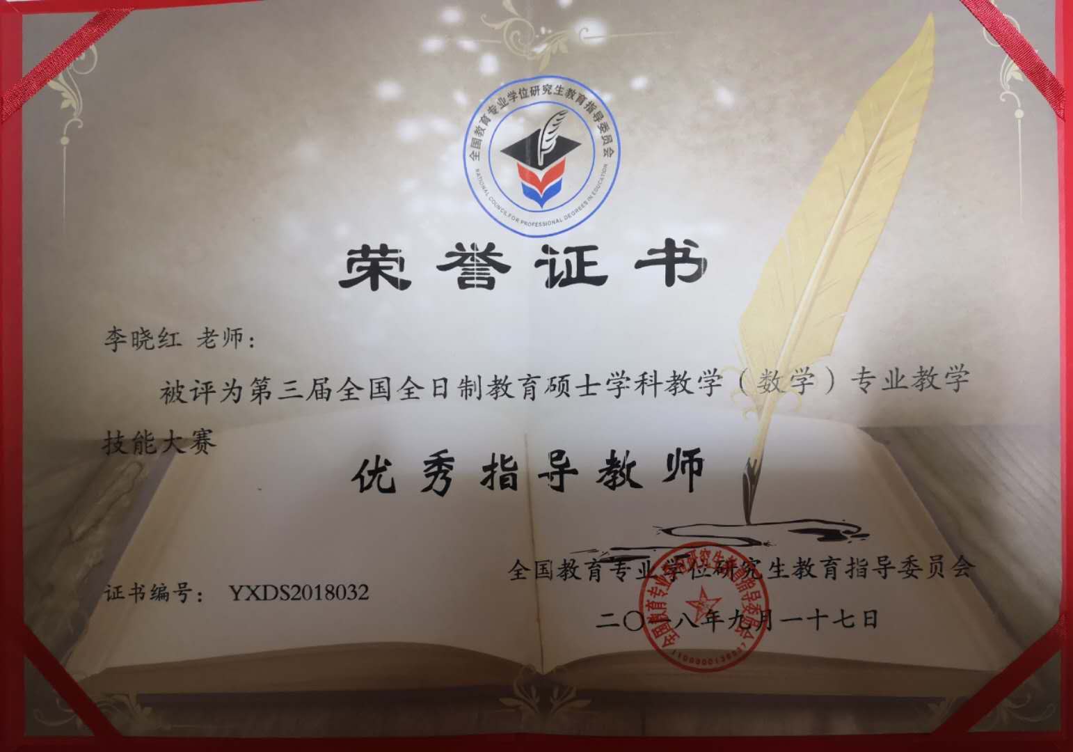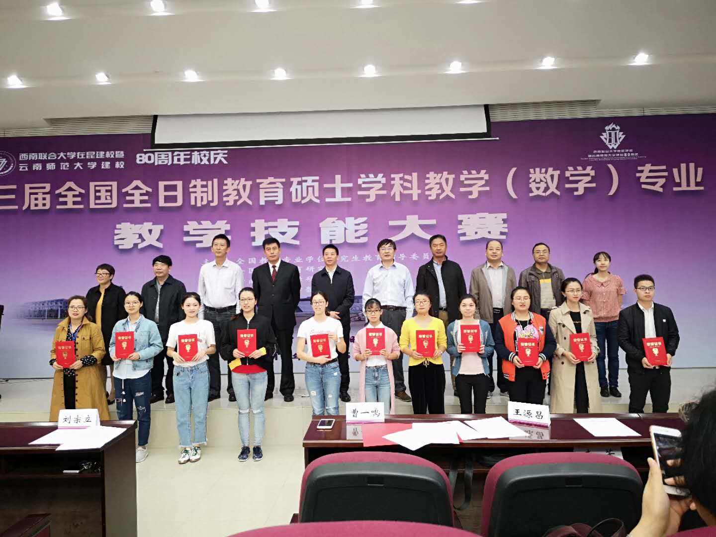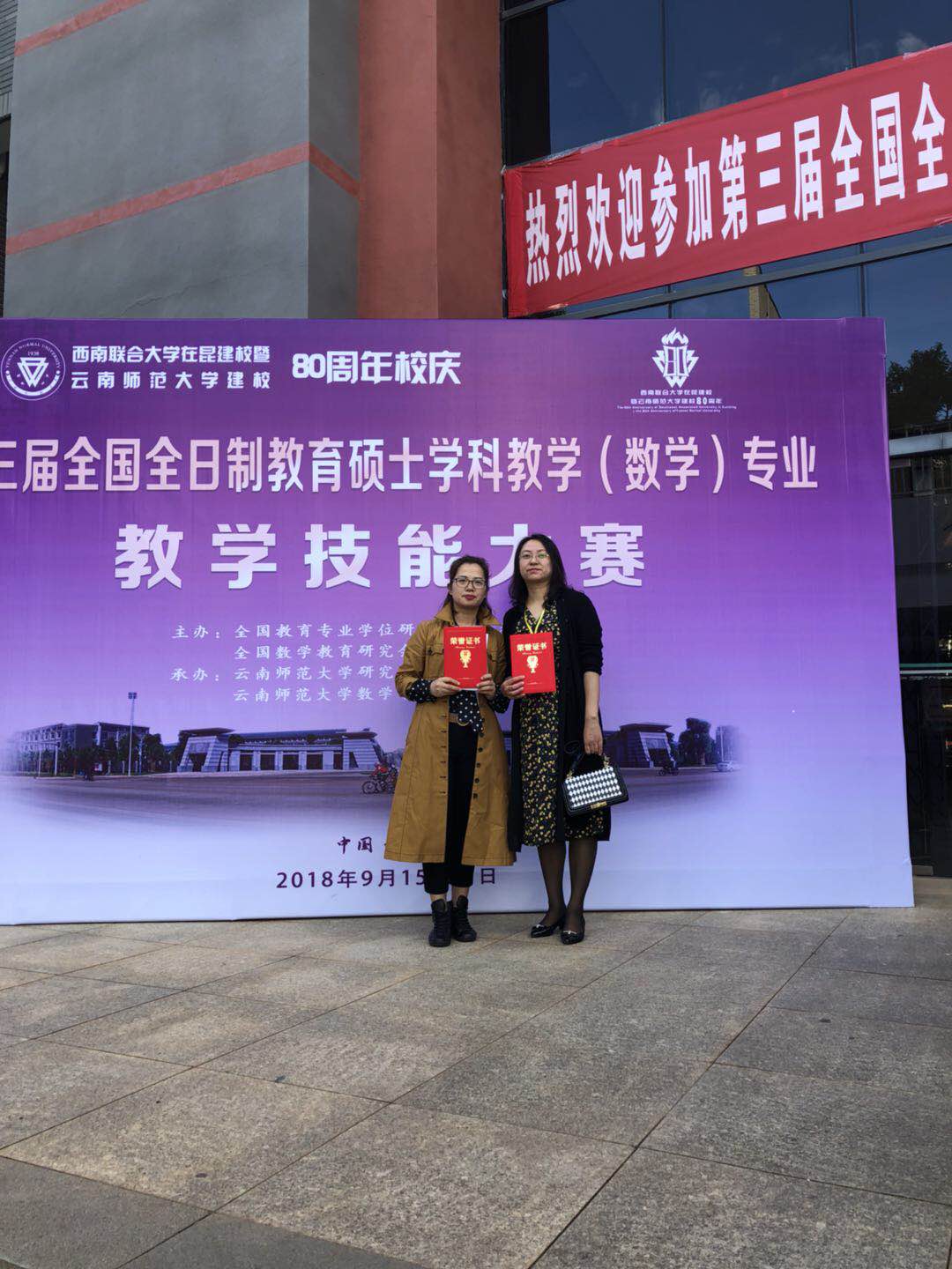 第三届全国全日制教育硕士学科教学(数学)专业教学技能大赛于2018年9月17日在云南师范大学落下帷幕,sunbet申搏官方网站理学院学科教学(数学)领域2017级研究生于海燕进入决赛,经过激烈角逐,荣获贰等奖,导师李晓红教授荣获优秀指导教师称号。