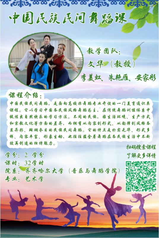 近日,黑龙江省教育厅公布2018年黑龙江省精品在线开放课程认定结果,sunbet申搏打造的以音乐与舞蹈学院文华教授担任课程团队负责人,李美虹、朱艳雁、安家彤等教师协同授课,硕士研究生荀举参与后台管理的MOOC--《中国民族民间舞蹈》成功入选,获批2018年黑龙江省精品在线开放课程,也成为sunbet申搏全面推进在线开放课程建设与应用,不断深化信息技术与教育教学深度融合,深入推进以学生为中心的课程改革、教学方式与学习方式变革取得的一项重要标志性成果。