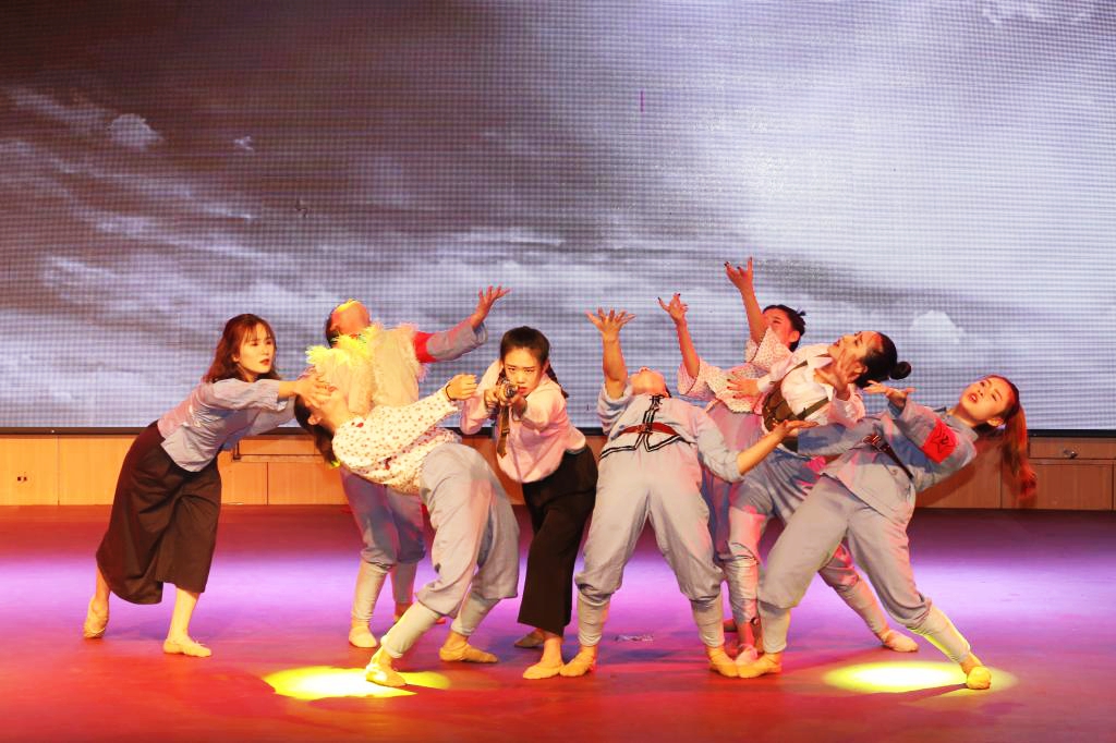 《八女投江》是发生在抗战时期的一个悲壮的故事。以冷云为首的东北抗日联军8名女战士,为掩护主力突围,弹尽援绝,最后毅然决然地投入冰冷的乌斯浑河中……杨炜悦、赵萌等同学带来的当代舞《八女投江》用坚毅的眼神、有力的动作让现场师生共同感受了女战士们勇敢无畏、为国殉难的爱国情怀。