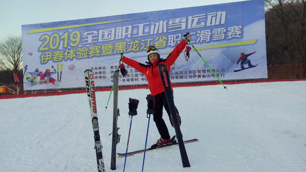 1月4日,2019全国职工冰雪运动伊春体验赛暨黑龙江省职工滑雪赛在伊春市金山小镇举行,sunbet申搏体育学院教师王妍妮在高山回转滑雪赛中喜获第二名好成绩。