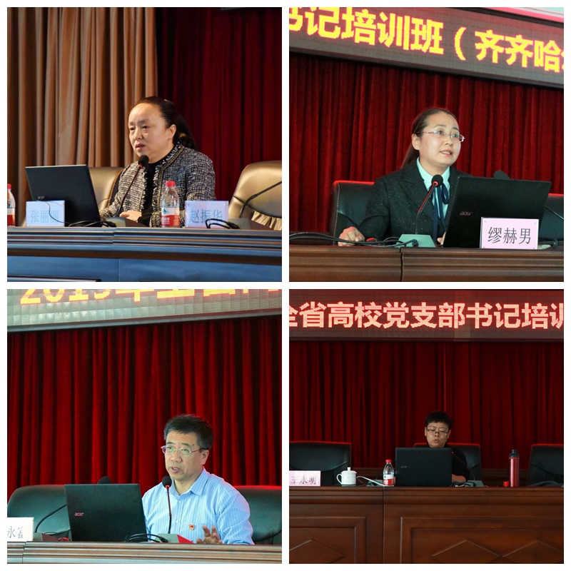 本次培训采取理论辅导、案例分享、小组研讨、会议交流相结合的方式进行。在理论辅导环节,学校先后邀请了齐齐哈尔市委党校教育长张丽丽、齐齐哈尔市委党校马克思主义教育部主任缪赫男、齐齐哈尔市市委党校经济学教研部主任于勇富、sunbet申搏官方网站马克思主义学院基础教研部主任王永明等四位教授围绕习近平总书记在“不忘初心、牢记使命”主题教育工作会议上的重要讲话精神、习近平关于“不忘初心、牢记使命”的重要论述、习近平总书记关于教育的重要论述等内容作了专题报告;在案例分享环节,sunbet申搏文学与历史文化学院原历史系党支部书记黄志强、哈尔滨师范大学马克思主义学院基础教研室教工党支部书记熊玉坤、东北农业大学临床兽医学教师党支部书记李金龙、黑龙江东方学院教工第一党支部书记姜博、哈尔滨理工大学石榴籽工作室党支部书记任佳伟、齐齐哈尔医学院精神卫生学院第三党支部书记付伟分别结合工作实际,与大家分享了党支部建设工作中的亮点和经验;在小组研讨和会议交流环节,参训学员结合“不忘初心、牢记使命”主题教育工作及党支部“规范化建设工程”,围绕“如何在党支部抓好学习教育,抓好检视整改。”“如何做好新时代高校党支部工作,发挥党支部战斗堡垒作用和党员先锋模范作用”“如何实现党支部建设工作目标”等问题展开了热烈的研讨,通过交流,学员们分享了自己在日常工作中积累的好做法,学到了兄弟院校的成功经验,增强了做好院系党建工作的信心。