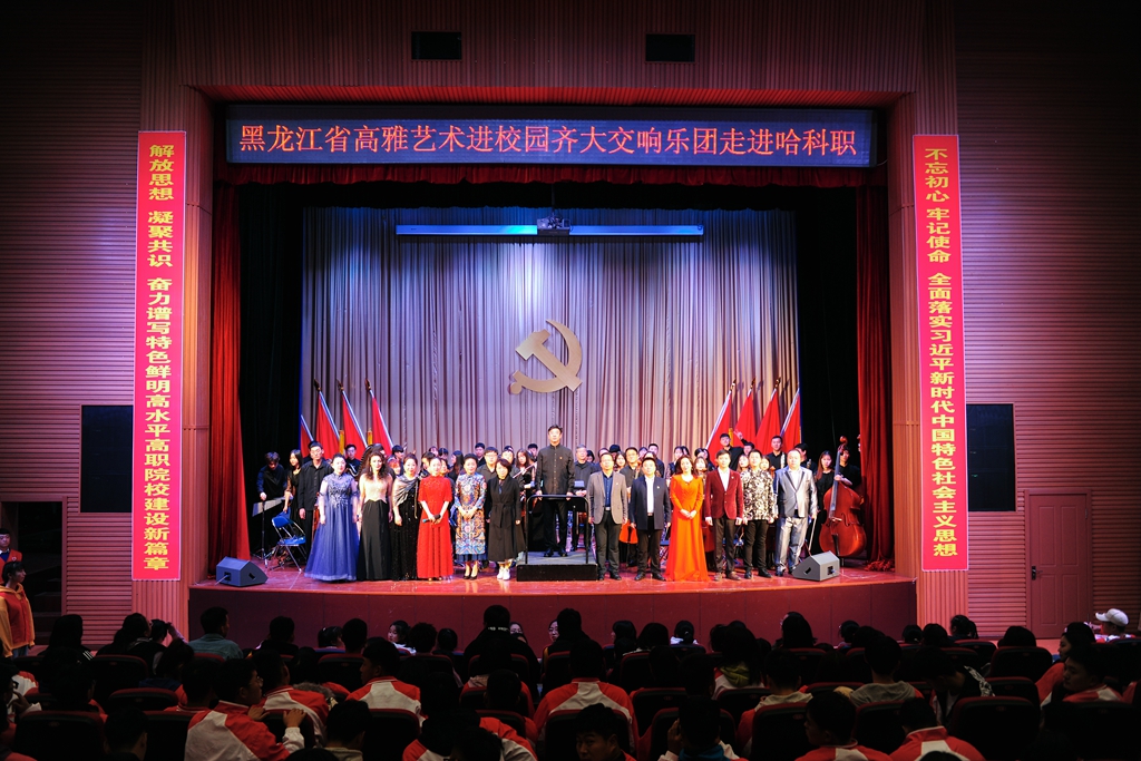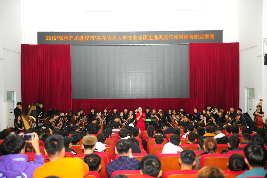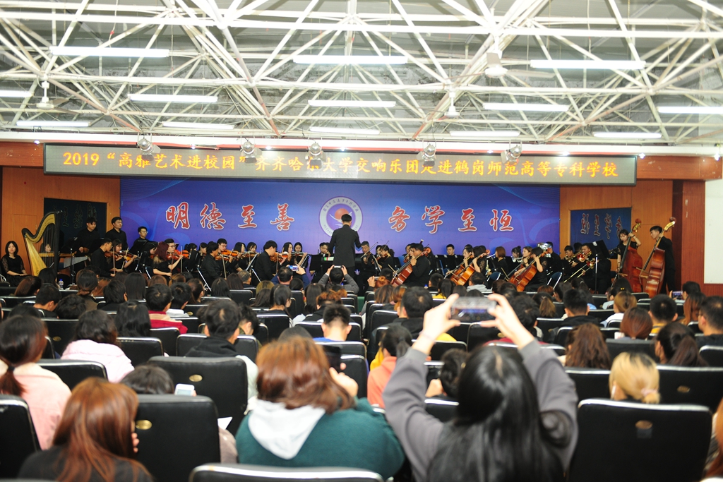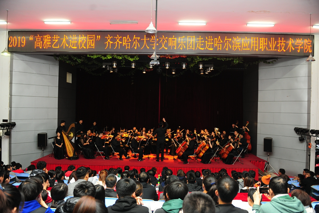 在新中国成立70周年的喜庆日子里,在第二批“不忘初心、牢记使命”主题教育深入开展之际,为传承和弘扬高雅艺术,10月14日至18日,受黑龙江省教育厅、文化和旅游厅、财政厅的委托,校党委宣传部副部长何强、音乐与舞蹈学院副院长殷进良,带领sunbet申搏官方网站交响乐团70余名师生,赴鹤岗师范高等专科学校、黑龙江冰雪体育职业学院、哈尔滨应用职业技术学院、哈尔滨科学技术职业学院,开展了四场“高雅艺术进校园”专场演出。