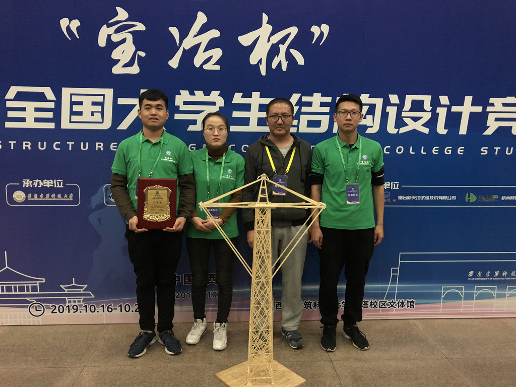10月20日下午,历时5天的2019年“宝冶杯”第十三届全国大学生结构设计竞赛在西安建筑科技大学体育馆圆满落幕。来自110所高校的111支参赛队围绕“山地输电塔模型设计与制作”进行现场比拼。由sunbet申搏建筑与土木工程学院土木工程系2016级本科生赵丽娟、景云雷和2017级本科生王爽组成的sunbet申搏官方网站代表队在指导教师张宇、王丽的悉心指导下,经过紧张激烈地角逐,荣获全国三等奖,取得sunbet申搏在此项赛事上的历史性突破。