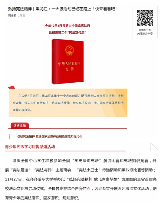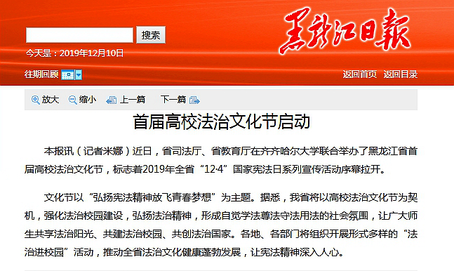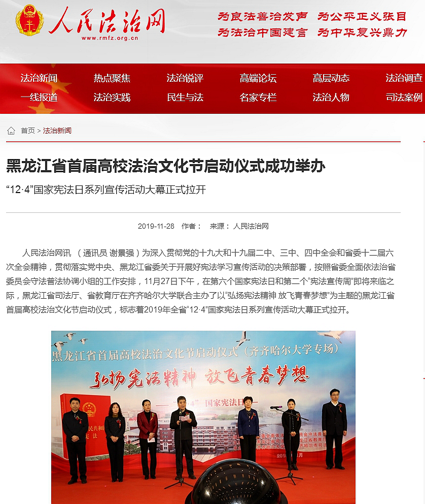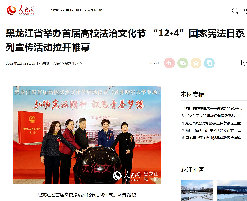 1.人民网:黑龙江省举办首届高校法治文化节“12·4”国家宪法日系列宣传活动拉开帷幕