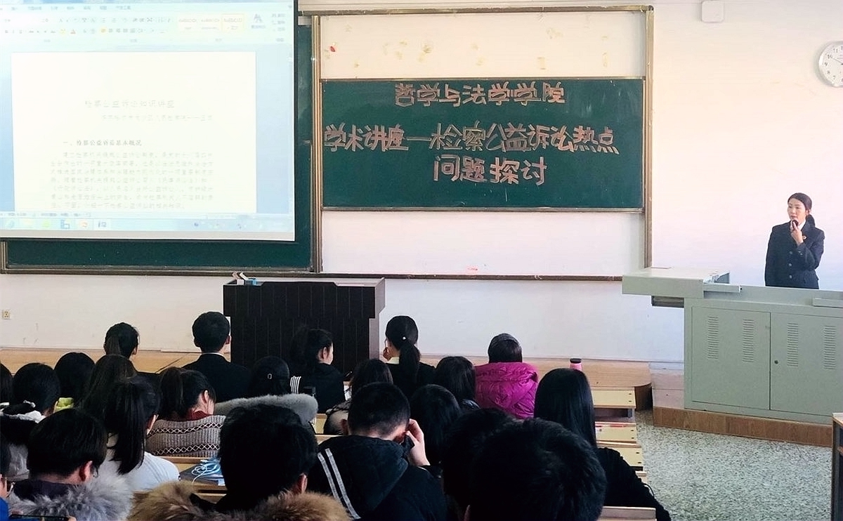 11月27日,学院邀请齐齐哈尔市龙沙区人民检察院公益诉讼检察部主任王丽做了题为“检察公益诉讼热点问题探讨”的学术讲座,使师生们加深了对公益诉讼制度的认识和了解,认识到公益诉讼对于维护国家和社会公共利益、规范行政行为、推进依法行政的重要意义。
