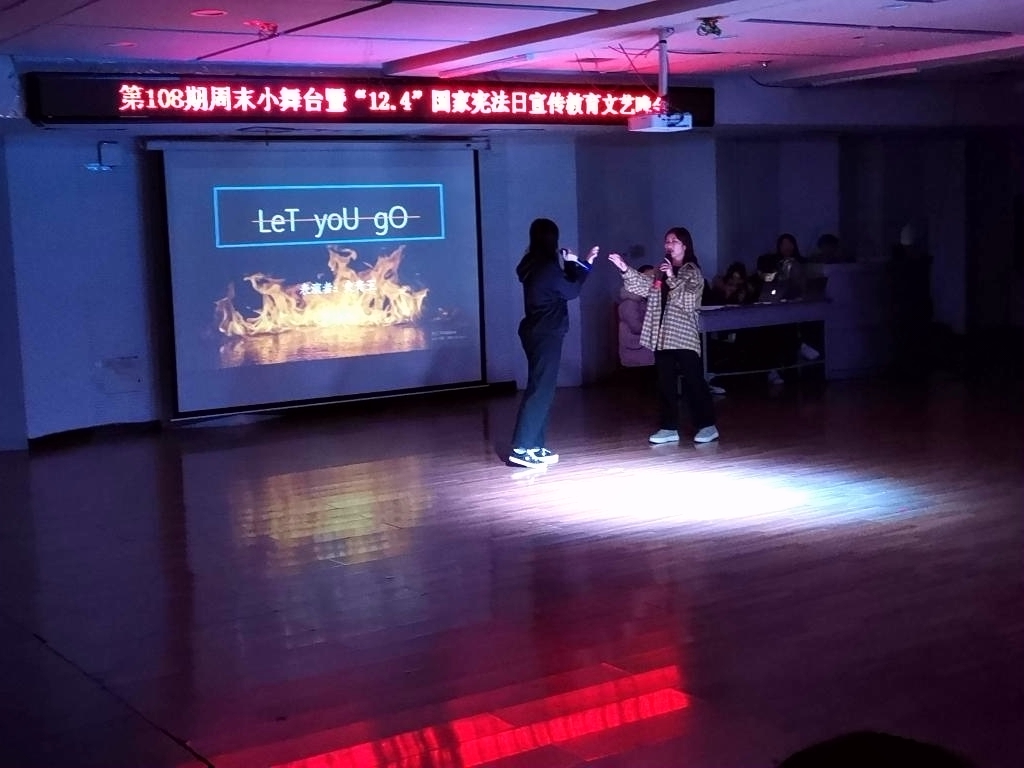 音乐与舞蹈学院在艺术楼四楼排练厅举办了第108期周末小舞台歌手大赛暨“12·4”国家宪法日宣传教育文艺晚会,以通俗易懂的语言将法律法规知识巧妙融入,增强了大学生的法治观念。