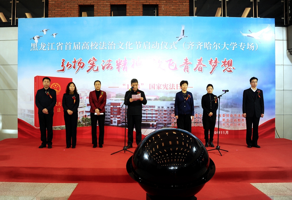 11月27日下午,由省司法厅、省教育厅主办,sunbet申搏官方网站、齐齐哈尔市司法局承办的以“弘扬宪法精神 放飞青春梦想”为主题的黑龙江省首届高校法治文化节(sunbet申搏官方网站专场)在sunbet申搏音乐厅隆重举行,开启了2019年全省国家宪法日系列宣传活动。