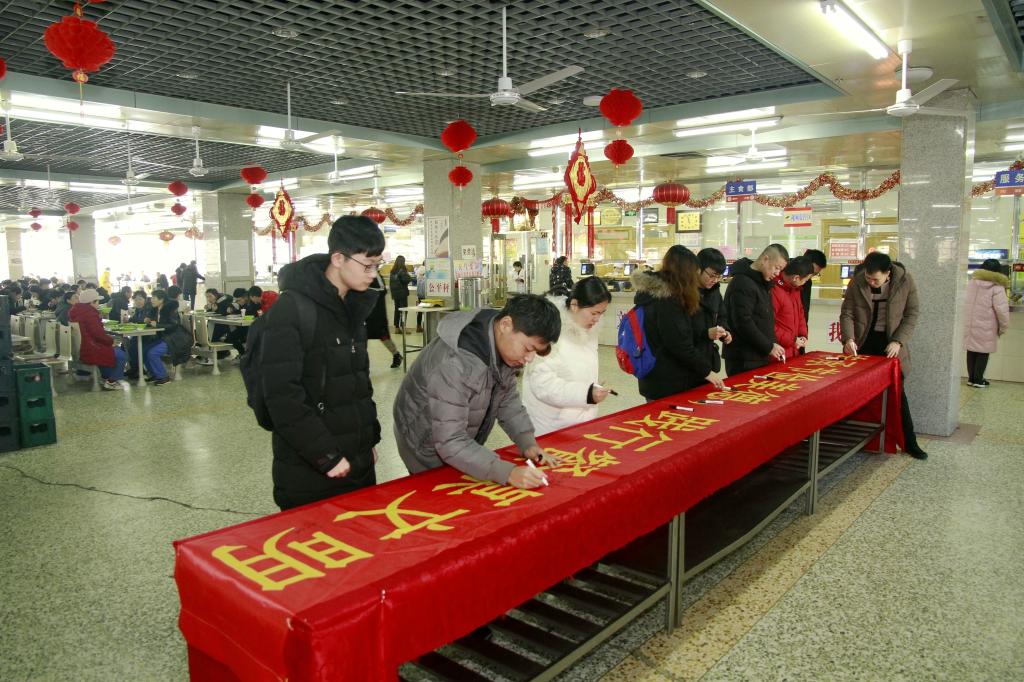 1月2日中午,学校在各学生食堂举办了“传承节俭美德、践行餐桌文明”师生签名活动。就餐的师生们在印有“传承节俭美德、践行餐桌文明”的巨大条幅上,郑重地签上了自己的名字,承诺要尊重劳动、珍惜幸福、理性消费、勤俭节约。同时,后勤管理处工作人员还向就餐师生发放了10000份倡议书,使文明用餐理念更加深入人心。
