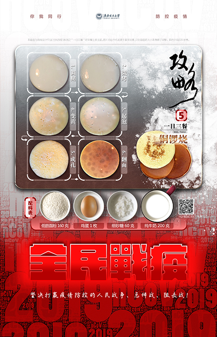 设计简介:以小面积的红色与大面积的灰白色做对比,2019nCoV作为背景基础图形要素,揭示了目前防疫工作的严峻性。海报以“全民战疫”为系列设计;告知普通民众在居家隔离期间应该重视的日常问题。本幅为一日三餐之简易版早餐铜锣烧的DIY制作攻略;引导民众自己动手制作营养美食,不仅增加了营养、提高了身体抵抗力,同时也愉悦了身心。在关爱个人和家庭成员健康的同时,也同样为全国人民战胜疫情做出了自己的贡献!