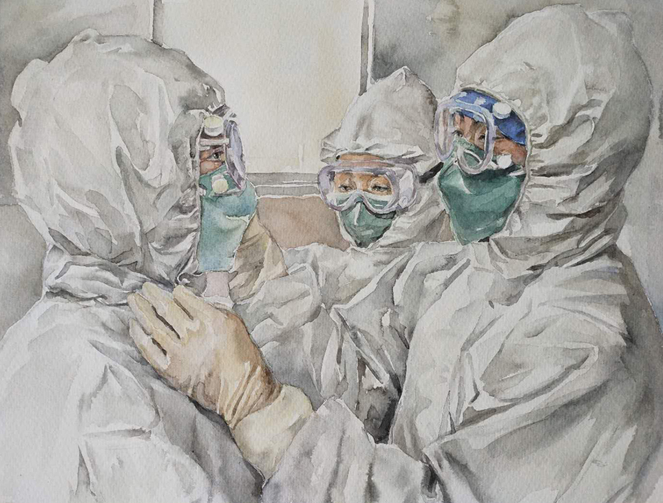 创作简介:医生、护士是美丽的天使,在大灾大疫发生时,他们更是救星。他们工作之余,身姿美丽自然英俊洒脱。我们赞美他们。