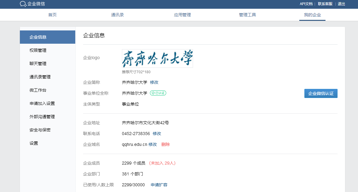 完成企业微信平台的搭建。从2月11日开始,网络信息中心开始搭建“sunbet申搏官方网站企业微信”平台,由于企业微信以学校的基本组织结构为基础单位,每名教师都要在组织结构中落实到科室、系部等,因此,落实任务人员多、工作量很大,网络信息中心设置了孙涌泉、祝文生、孙家良、李玲玲等4名系统管理员,学校各单位设置1名管理员对本单位人员进行邀请、加入、分类、管理,同时在线开展使用答疑、操作培训、技术问题处理。在所有同志的配合下,用了三天时间,将2299名教职工加入企业微信平台,为下一步智慧校园建设和信息化应用工作奠定了基础。制作企业微信视频会议教程文档加入微云盘共享,为各单位使用企业微信召开远程视频会议提供方便。