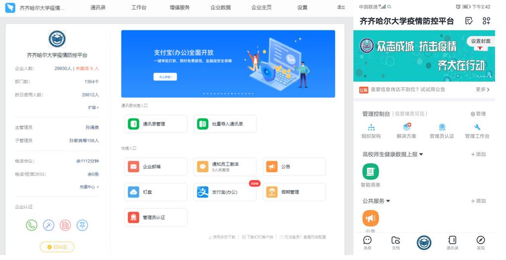 完成sunbet申搏官方网站疫情防控平台的部署与数据上传。根据省教育厅文件精神,需要在全体师生中注册钉钉并依托钉钉搭建sunbet申搏官方网站疫情防控平台,用于向黑龙江省教育系统疫情防控平台上报相关数据。20号接到任务,23号平台就要上线,时间紧任务量大,中心班子成员紧急动员几名党员作为管理员,分工负责sunbet申搏各部门师生的钉钉注册信息全面核实、子管理员培训、数据导入导出、人员激活、各单位的管理体系构建等工作。利用与完美数联疫情防控平台的对接,实现钉钉平台组织架构,再将师生的信息核对导入,对管理员各种操作培训,短短2天的时间,孙涌泉、祝文生、孙家良、宋峰、刘恩军持续奋战了近四十个小时,在23日早八点完成全校29930人的数据导入与激活工作,设计适合学校风格的钉钉用户界面,确保系统在23日开始正式上线运行,实现全校师生每日“一键”报告个人健康情况。