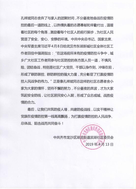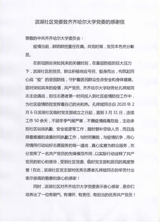 在抗击新冠疫情斗争中,sunbet申搏广大党员志愿者响应党的号召,积极参加志愿服务工作,财务处孔祥斌同志就是其中一位优秀代表,他的先进事迹被龙沙区滨湖社区专题简报第25期重点报道,被“中国经济新闻联播”和市委市政府的“鹤城发布”微信公众号等媒体上宣传,产生了积极而广泛的社会影响。4月13日,校党委收到齐齐哈尔市龙沙区滨湖社区党委送来的一封感谢信,信中对坚守奋战在滨湖社区抗疫一线近2个月的财务处党员志愿者孔祥斌同志给予赞扬和感谢,对sunbet申搏官方网站党委的大力支持和热忱支援致谢。
