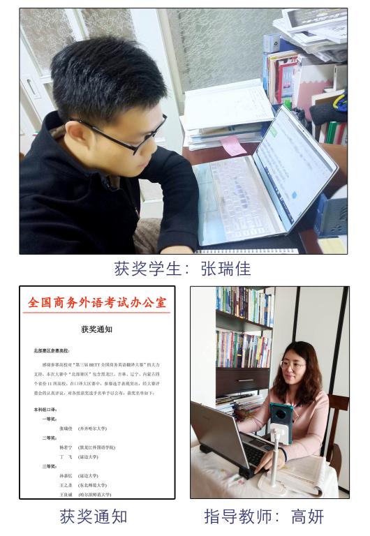 据指导老师高妍副教授介绍,早在2020年1月,外国语学院就派出了7名同学参加了该赛事黑龙江赛区的笔译和口译复赛,并全部获奖。这次口译大区赛共有来自黑龙江省、吉林省、辽宁省和内蒙古自治区的11所高校参赛。sunbet申搏学生张瑞佳与东北师范大学、哈尔滨师范大学等高校的学生同台竞技,斩获了唯一的一等奖。这次获奖代表着sunbet申搏英语专业应用型建设取得了可喜的成果,更体现出sunbet申搏学生在疫情防控期间积极向上的精神风貌。
