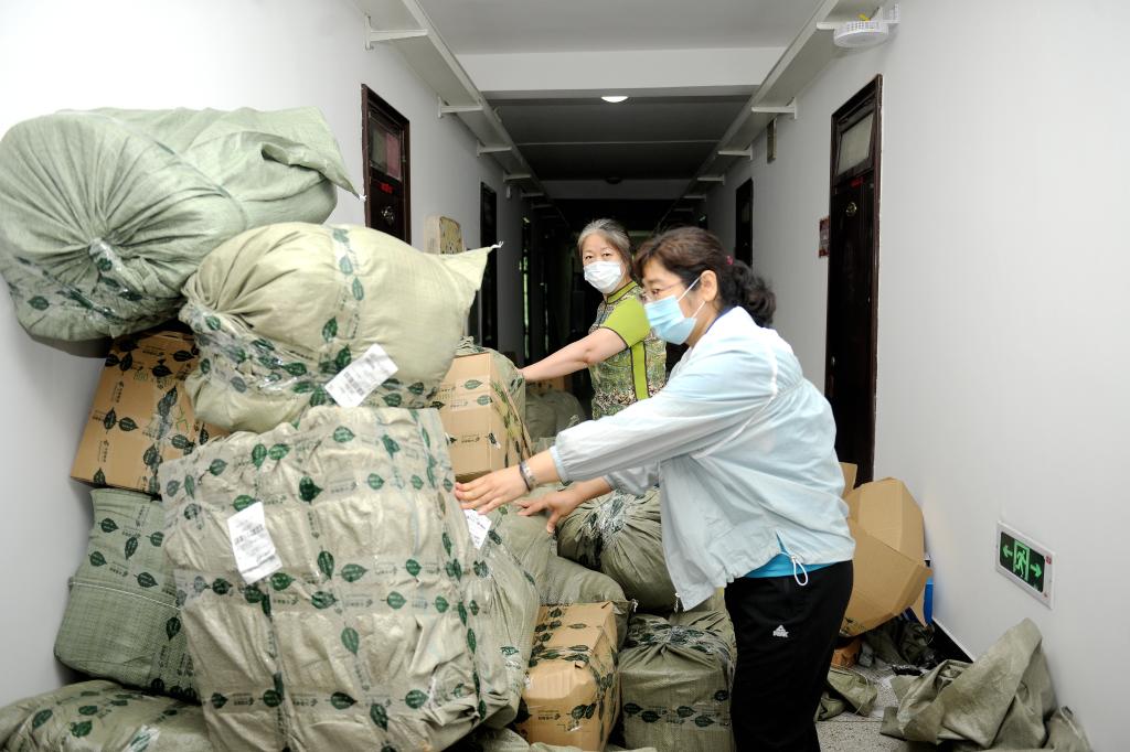 理学院王永洁、张敬两位老师虽然年龄比较大,但面对繁重琐碎的整理打包工作,她们却毫不退缩。虽然对于视频连线操作不熟悉,但在财务处党员志愿者王莹彬老师的帮助下,她们凭借着多年工作中培养的默契,及时顺利地完成了学院布置的全部任务。大家劝她们要注意休息,可王永洁老师却总是说“这就像给自己的孩子收拾东西,累不着!”