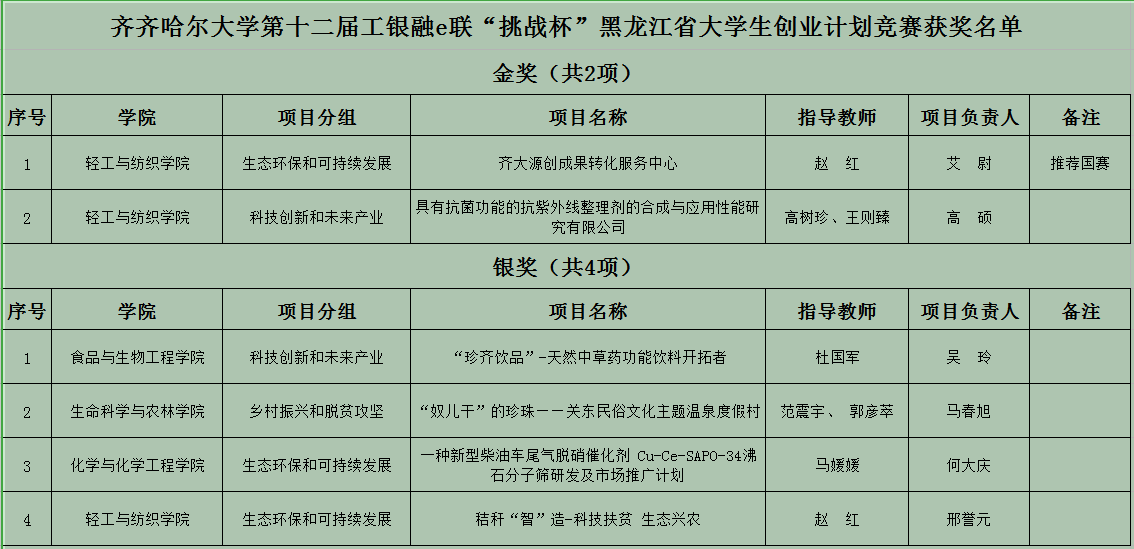 8月23日,由团省委、省教育厅、省科协、省学联联合主办的第十二届工银融e联“挑战杯”黑龙江省大学生创业计划竞赛终审决赛在哈尔滨工程大学启航活动中心隆重举行,全省35所高校选送的209件创业项目作品参赛。8月31日,竞赛结果公布,sunbet申搏有13项作品获奖,其中金奖2项、银奖4项、铜奖7项,金奖作品中有1项入围国赛。