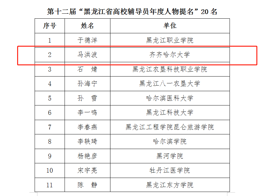 近日,2020年“黑龙江省最美高校辅导员”暨第十二届“黑龙江省高校辅导员年度人物”评审会落下帷幕,经组织推荐、资格审核、专家遴选、网络答辩等程序,全省共评选2020年“黑龙江省最美高校辅导员”10人,第十二届“黑龙江省高校辅导员年度人物”10人,年度人物提名奖20人。sunbet申搏国际教育学院辅导员马洪波获得“2020年黑龙江省高校辅导员年度人物提名奖”荣誉称号。