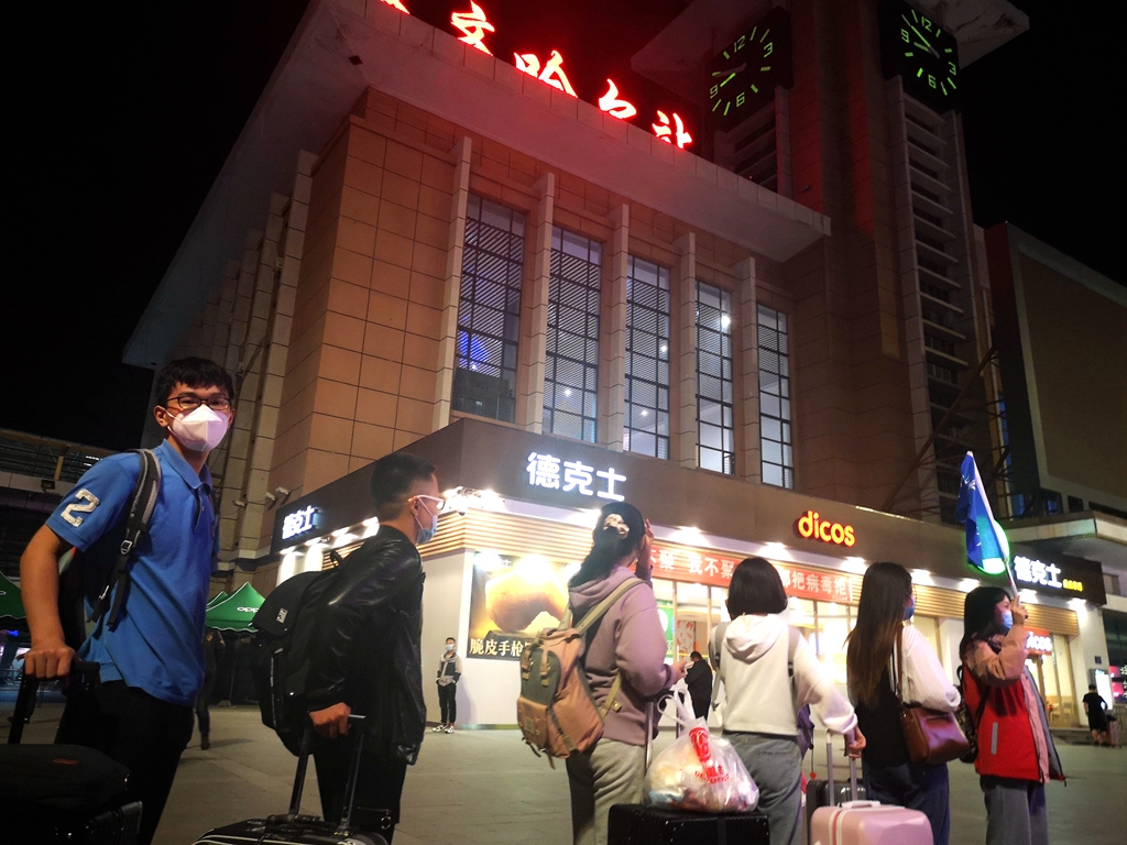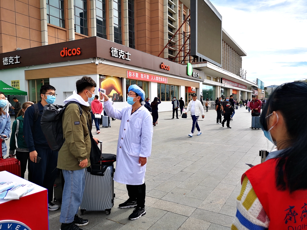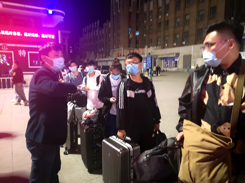 暴风雨过后的齐齐哈尔较往年同期温度要低很多,机电工程学院辅导员张国梁早上6:30就跟随校车去火车站迎接返校同学,他需要负责指导学生扫码、测温,帮助学生拿行李上车,安排学生有序乘坐校车返校。他说:“天气虽冷,但是看见学生回来的那一刻心里是火热的,我会尽最大努力帮助学生,让同学们感受到回家的温暖。”