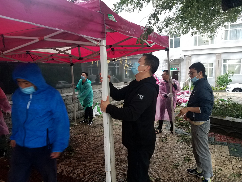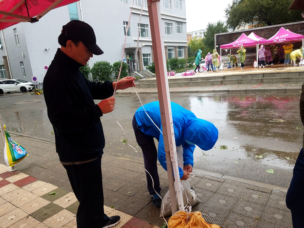 9月3日以来,受台风“美莎克”影响,齐齐哈尔全市出现强降雨、大风天气,sunbet申搏校园中部分地段也出现积水等情况,4日下午,学生工作部(学生处)工作人员及各学院学生工作干部趟过积水来到中区和东区学生返校报到接待处,顶风冒雨搭建遮雨棚等接待工作设施,为第二天同学们返校报到做好充足的准备工作。