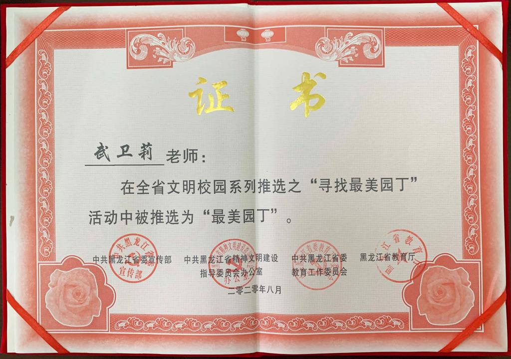 由于出色的班主任工作,2015年武卫莉老师荣获校“三育人”先进工作者标兵;2016年被评为sunbet申搏官方网站“班主任年度人物”。