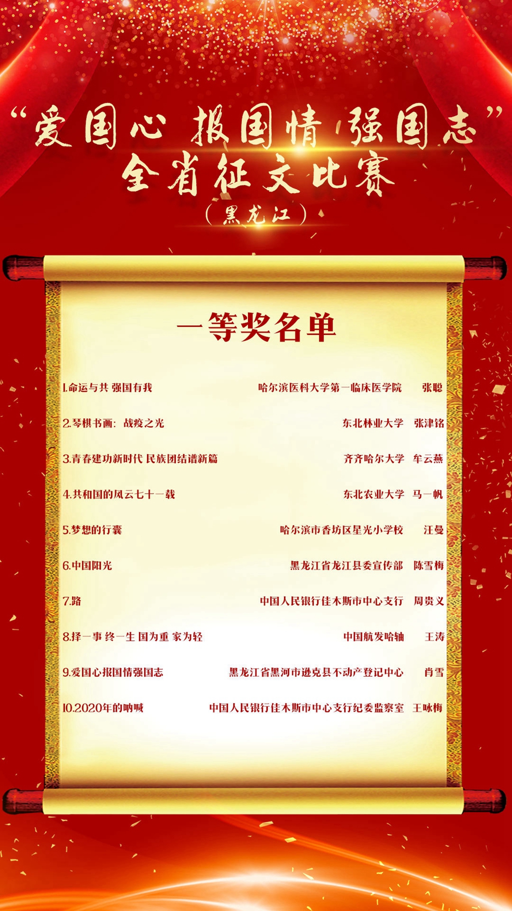 此次征文比赛活动旨在为广大青年学子抒发自己的强国志向打造平台,激励广大学生志存高远、脚踏实地,争做时代新人,勇担时代使命,把个人的理想追求融入党和国家事业之中,进一步树立为党、为祖国、为人民多作贡献的坚定信念。据悉,获奖征文将在“学习强国”黑龙江平台“强国征文”栏目刊发,“极光新闻”客户端、“黑龙江宣传”微信公众号将开设专题,同步进行展示。