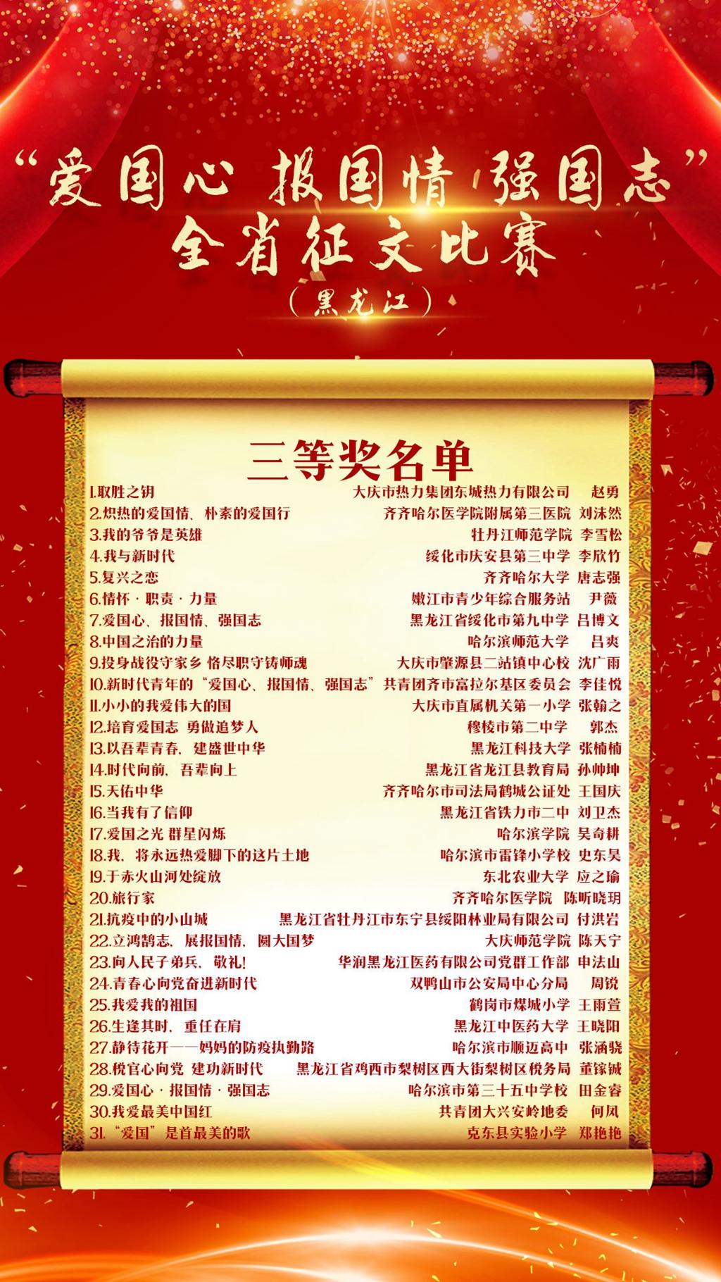 为深入贯彻落实习近平新时代中国特色社会主义思想,深化爱国主义教育,促进青少年健康成长,培养担当民族复兴大任的时代新人,“学习强国”学习平台开展了以“爱国心·报国情·强国志”为主题的征文活动。11月12日,“学习强国”黑龙江学习平台发布了征文活动获奖名单,sunbet申搏遴选推荐的两篇原创作品在全省征文活动中分获一等奖和三等奖,在全省高校名列前茅。