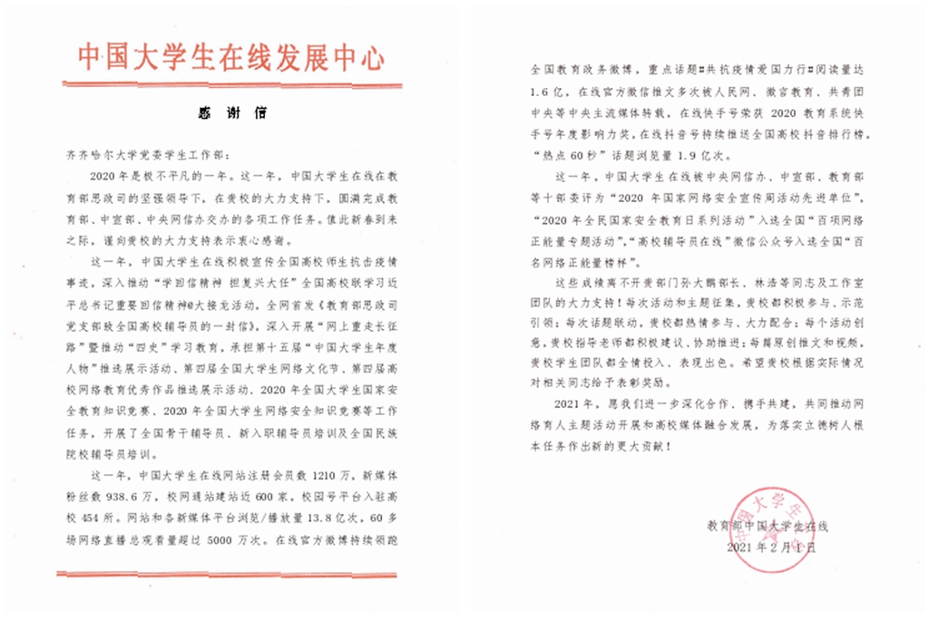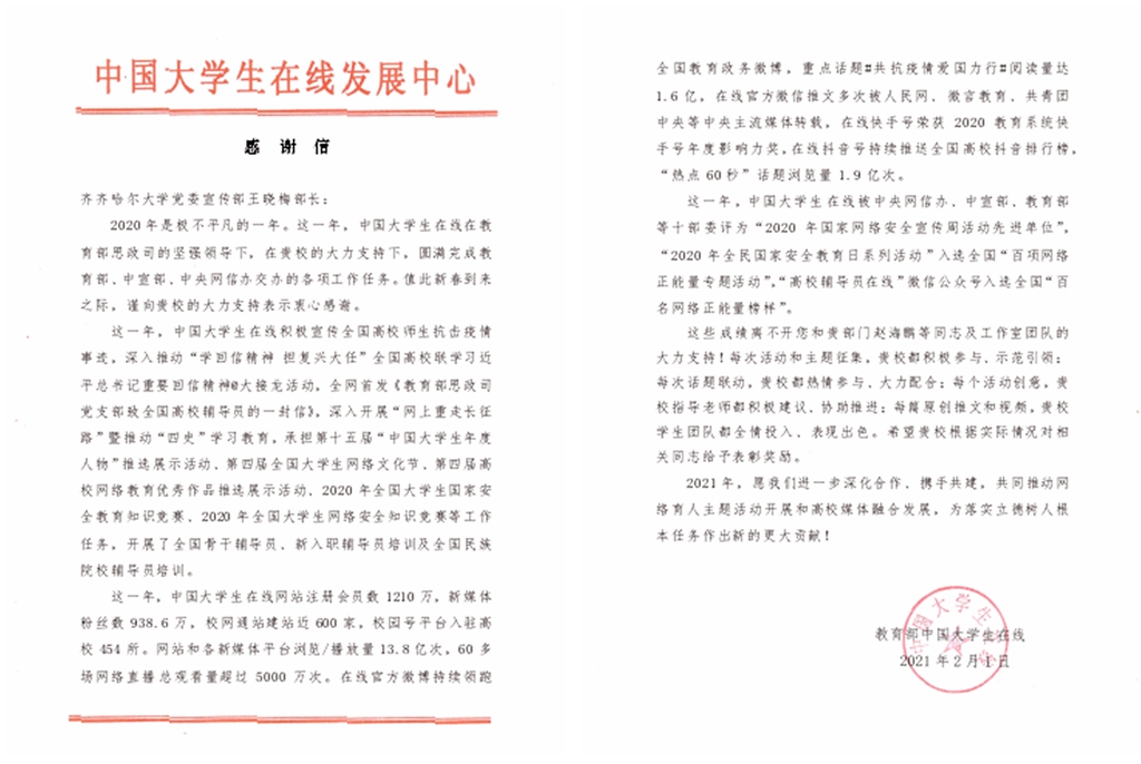 2月1日,教育部中国大学生在线向sunbet申搏党委常委、宣传部长王晓梅和sunbet申搏学生工作部(学生处)发来感谢信。信中表示,2020年是极不平凡的一年。这一年,中国大学生在线在教育部思政司的坚强领导下,在sunbet申搏官方网站的大力支持下,圆满完成教育部、中宣部、中央网信办交办的各项工作任务。值此新春到来之际,谨向sunbet申搏官方网站的大力支持表示衷心感谢。