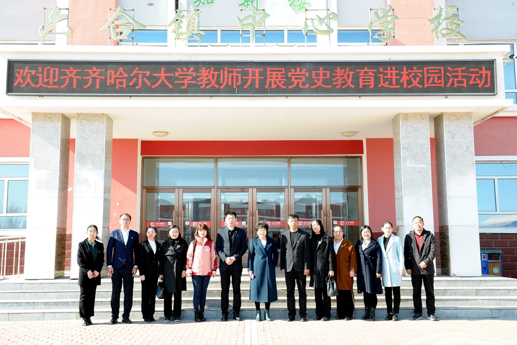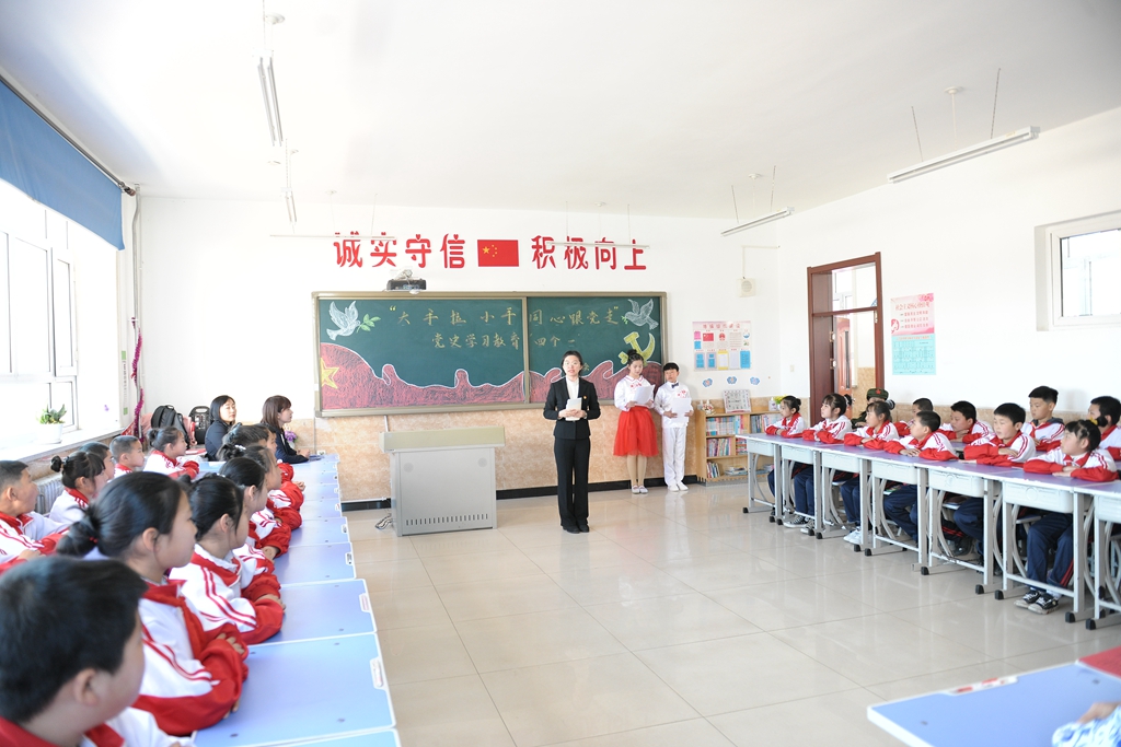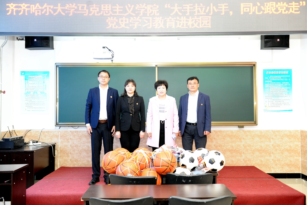 为庆祝中国共产党建党100周年,深入学习贯彻习近平总书记在学校思想政治理论课教师座谈会上的讲话精神,贯彻落实《关于在全党开展党史学习教育的通知》要求,以及中共中央办公厅、国务院办公厅印发的《关于深化新时代学校思想政治理论课改革创新的若干意见》的文件精神,创新习近平新时代中国特色社会主义思想进教材、进课堂、进头脑模式,推动大中小学思政课一体化建设,切实开展好“我为群众办实事”实践活动。4月14日下午,马克思主义学院青年教师读书会来到讷河市六合中心学校开展党史故事进校园活动——“大手拉小手,同心跟党走”党史学习教育“四个一”主题班会。讷河市团市委书记高岳、六合中心校校长李秀梅、sunbet申搏马克思主义学院领导和青年教师读书会成员一同参加了活动。