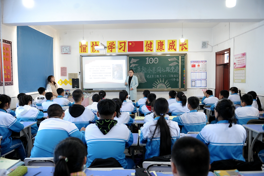 马克思主义学院还积极创新宣讲模式,青年教师读书会的部分教师到讷河市六合镇中心校开展“大手拉小手 同心跟党走”送党史宣讲到县乡村中小学活动。此次宣讲活动以“四个一”为主要内容,根据中小学生的年龄特点和认知水平确定了“演唱一支党的赞歌”“讲述一个党的故事”“朗诵一首党的诗歌”“写一封给党的书信”等活动形式,活动内容丰富、形式新颖、富有教育意义,受到了中小学生的热烈欢迎。