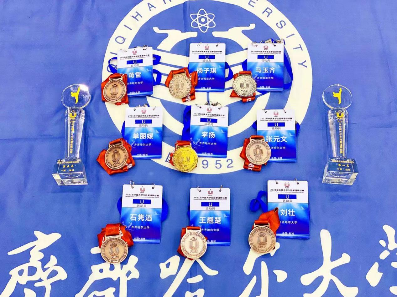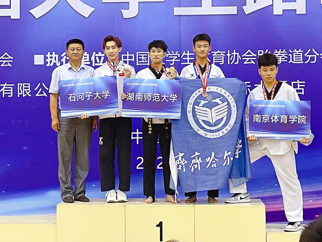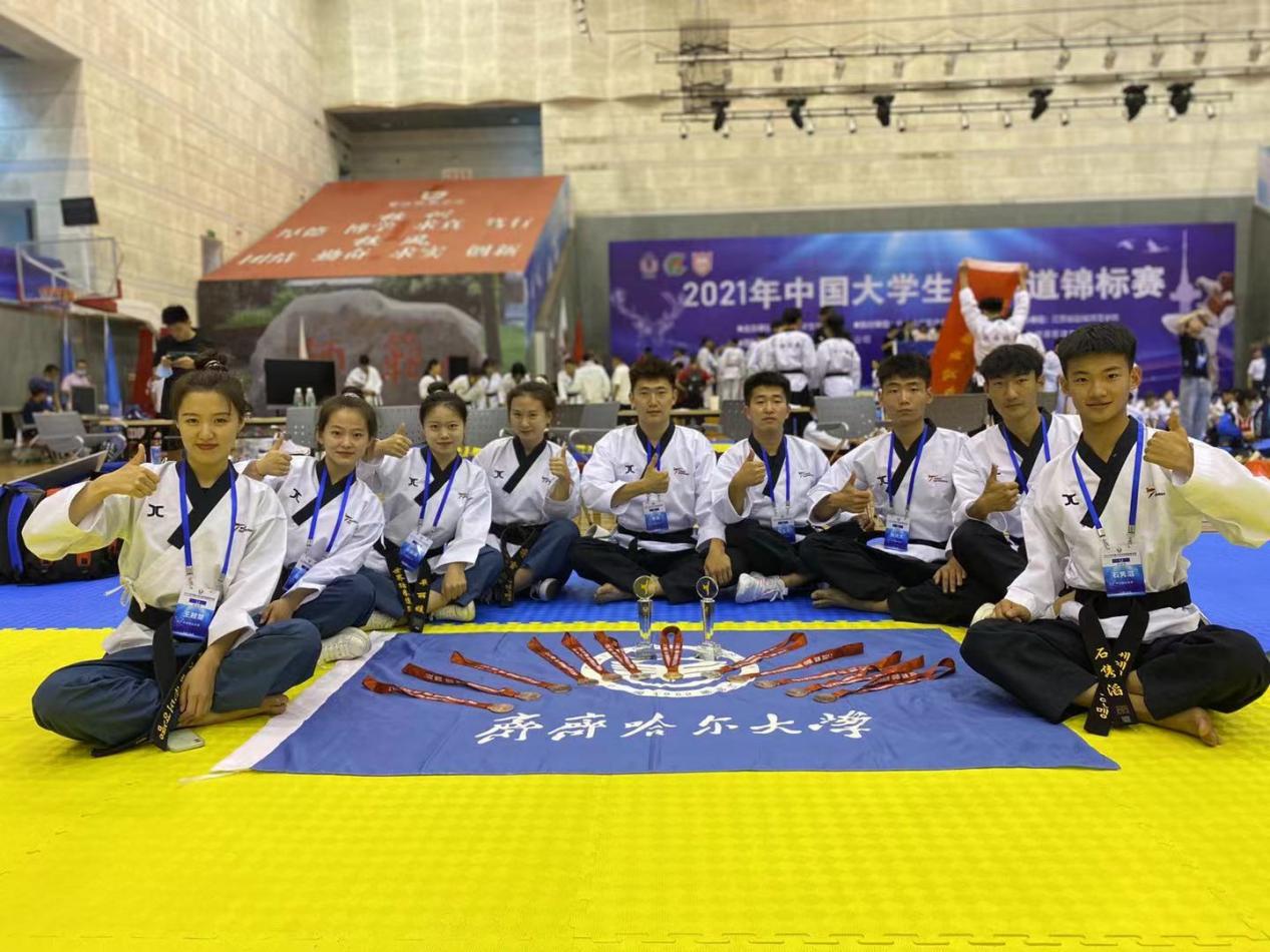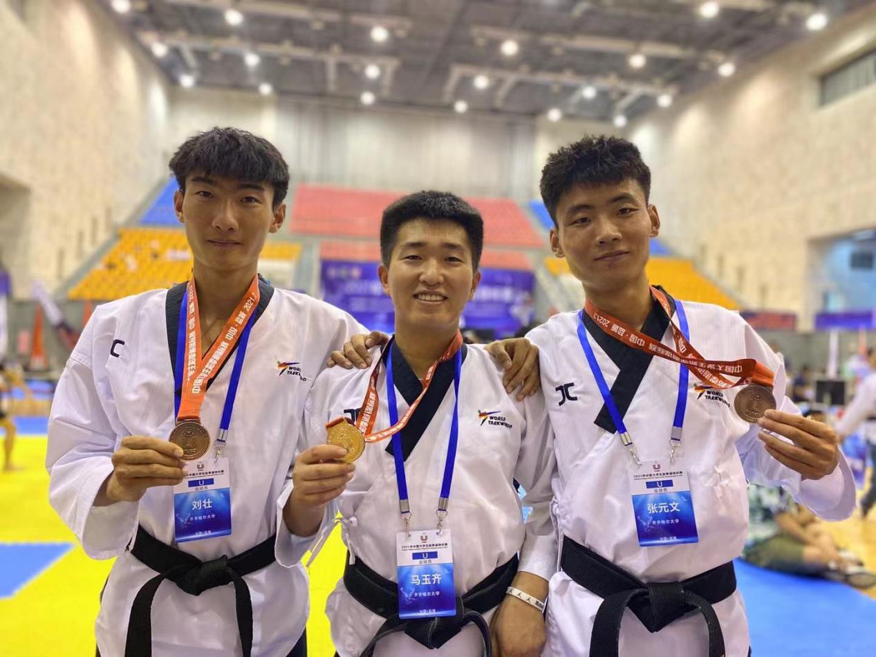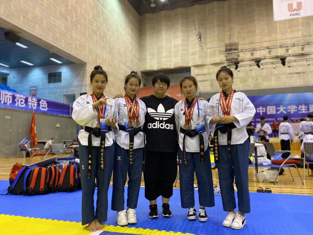学校对此次大赛高度重视,由体育学院修月老师带领9名学生参加此次国家级别赛事。经过五天激烈的赛场角逐,取得了1金、2银、6铜的好成绩。sunbet申搏学生李扬获得男子个人品势金牌;杨子琪、马玉齐两名同学荣获银牌;王翘楚、蒋雪、单丽媛三名同学荣获女子团体品势铜牌;张元文、刘壮、石隽滔三名同学荣获男子个人、团体铜牌;跆拳道舞获得团体项目铜牌。并取得了高水平组团体总分第四的历史性突破成绩。
