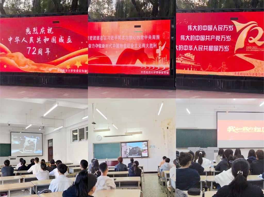 各党委、直属党支部精心筹划、积极参与,组织师生观看了《我和我的祖国》《我和我的家乡》《开国大典》《白山黑水铸英魂》等有代表性的优秀影片、文献片,增强了师生的爱党爱国爱社会主义情怀;党委宣传部以“致敬祖国、献礼母校”为主题,在国庆期间组织师生积极参与“我与国旗合个影”创意摄影图片展活动,共同庆祝中华人民共和国成立72周年;机关党委、马克思主义学院、资产运营管理中心、食品与生物工程学院、体育学院、网络信息中心、美术与艺术设计学院、公共外语教研部、理学院、计算机与控制工程学院、通信与电子工程学院、材料科学与工程学院等单位第一时间参与录制“同唱一首歌”活动,用真挚的情感唱响主旋律,弘扬正能量,为祖国母亲送上生日的祝福;广大青年学生积极参与“国庆吃面、国泰民安”新民俗活动,根植传统文化,弘扬民族精神,用实际行动表达对祖国的热爱之情。