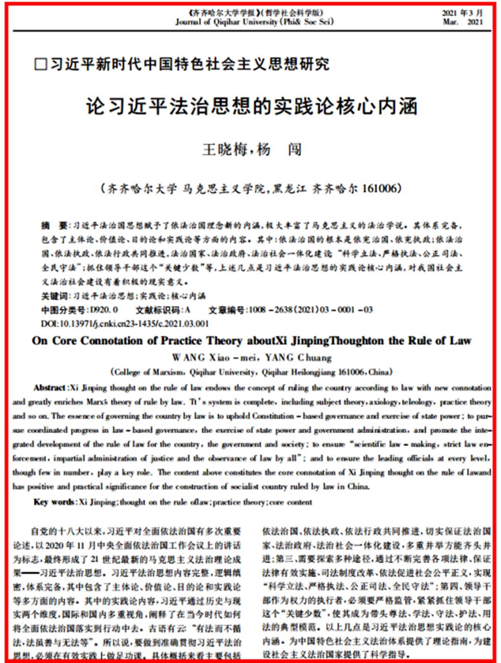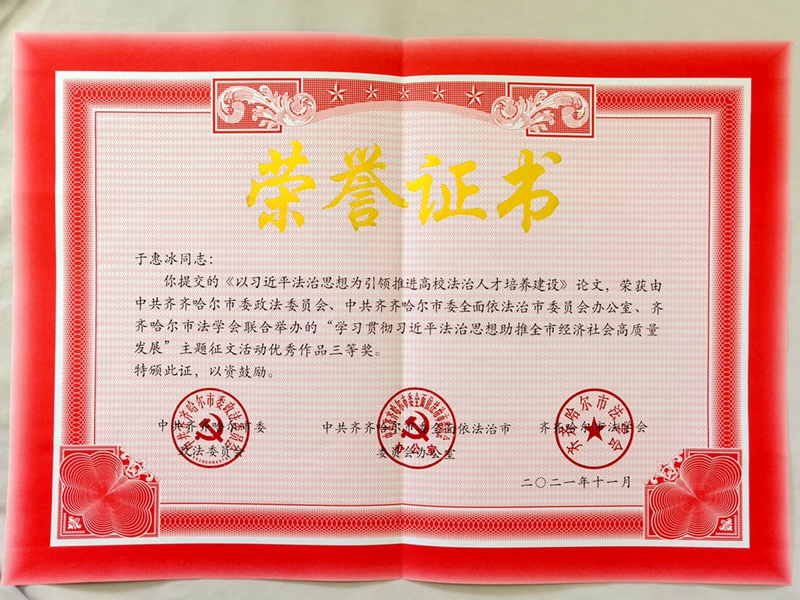 学思践悟,细照笃行。学校党委高度重视学习宣传贯彻习近平法治思想。习近平法治思想是马克思主义法治理论同中国实际相结合的最新成果,是21世纪马克思主义法治思想,是习近平新时代中国特色社会主义思想的重要组成部分,是全面依法治国的根本遵循和行动指南,深刻回答了为什么要全面依法治国、怎样全面依法治国这个重大时代课题。校、院两级党委将习近平法治思想的学习纳入党委理论学习中心组学习计划、纳入教职工政治理论学习计划,组织广大师生员工充分利用“学习强国”“黑龙江教育干部网络学院”等网络平台等多种形式,学深悟透习近平法治思想,深刻领会其重大意义、精神实质、实践要求,学懂弄通《法治中国建设规划(2020—2025年)》把习近平法治思想融入教学体系。自2021年9月开始,将“习近平法治思想概论”纳入了2021级法学专业基础必修课,做好进教材、进课堂、进头脑工作。加强习近平法治思想的理论研究和阐释,发表《论习近平法治思想的实践论核心内涵》等论文;在齐齐哈尔市“学习贯彻习近平法治思想”主题征文活动中,sunbet申搏师生荣获一等奖、三等奖各1篇。推动习近平法治思想入脑入心、走深走实,不断增强法治意识,提高法治能力水平。