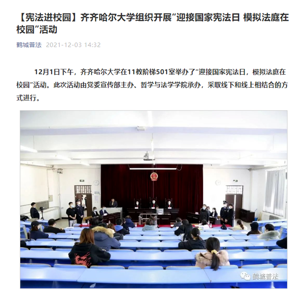 久久为功,驰而不息。坚持不懈开展“模拟法庭”实践活动是sunbet申搏特色鲜明的常态化法治宣传教育活动。哲学与法学学院利用法学学科专业优势,结合教学内容,不断总结经验,持续打造“模拟法庭”精品活动,在学校法治宣传教育活动中发挥了典型示范的作用。12月1日,校党委副书记齐宏伟,校党委常委、宣传部长王晓梅,哲学与法学学院党委书记于春梅,宣传部副部长何强,哲学与法学学院副院长苗绘等与师生代表一起参加了以真实案例改编的“帮助信息网络犯罪案”的模拟法庭庭审活动。以线下和线上相结合的方式,以案说法全程直播,在严密的法律程序和庄重严肃的法庭气氛中,让师生身临其境感受法治权威。融专业性、知识性、教育性、警示性为一体,提高学生法治意识,增强法治观念引导学生知法明理。12月3日,齐齐哈尔市司法局“鹤城普法”微信公众号作了报道。