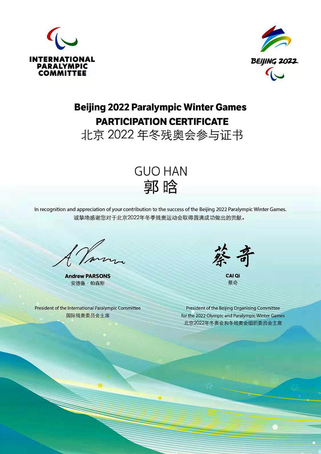 在北京残奥会执裁工作中,郭晗老师为终点NTO主管,负责终点线、缓冲区、混合区的全面工作,这里既有终点判罚组织工作还有与反兴奋剂部门、与颁奖部门、新闻媒体、安保等多部门的配合衔接与全面管理工作;王诚民老师为终点线裁判员,负责每组运动员通过终点线时的名次和是否犯规判定工作,终点线区域的通行控制工作,绘制终点线和及时清除终点线上的浮雪,以及配合相关部门对终点区域突发事件的处理工作。
