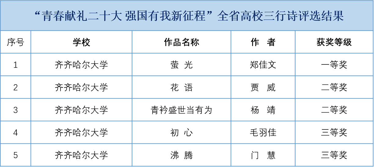 日前,黑龙江省高校网络思想政治工作中心下发了《关于开展“青春献礼二十大 强国有我新征程”全省高校三行诗征集活动的通知》,校党委宣传部按照通知要求广泛宣传,积极组织学生以三行诗的形式表达爱国之情和青春之志,共征集优秀三行诗作品200余首,经过学校评审,择优上报了10首优秀三行诗作品。