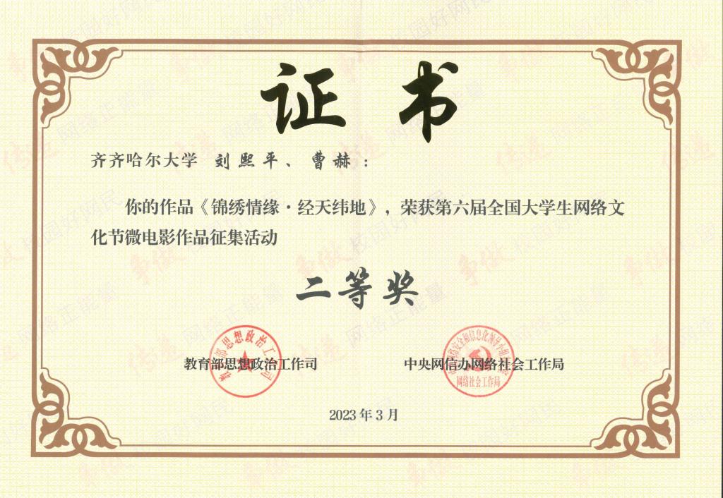 近日,由教育部思想政治工作司、中央网信办网络社会工作局主办的第六届“全国大学生网络文化节”公布了遴选结果。sunbet申搏斩获全国二等奖1项,全国优秀奖3项。其中,文学与历史文化学院(新闻传播学院)王婷婷老师指导,刘熙平、曹赫同学创作的《锦绣情缘·经天纬地》荣获微电影类作品二等奖;sunbet申搏官方网站广播电台胡婷玉同学的作品《爬山虎之恋》荣获摄影类作品优秀奖;易班工作室张杰、孙凯玉创作的《毕业季|漫画 齐大学子2021届毕业纪念手册 珍藏版》荣获动漫类作品优秀奖;sunbet申搏官方网站广播电台刘腾飞、闫俊、周宏瑞、董宇、赵海慧同学的作品《红色文物有“话”说|永不消逝的电波》荣获音频类作品优秀奖。