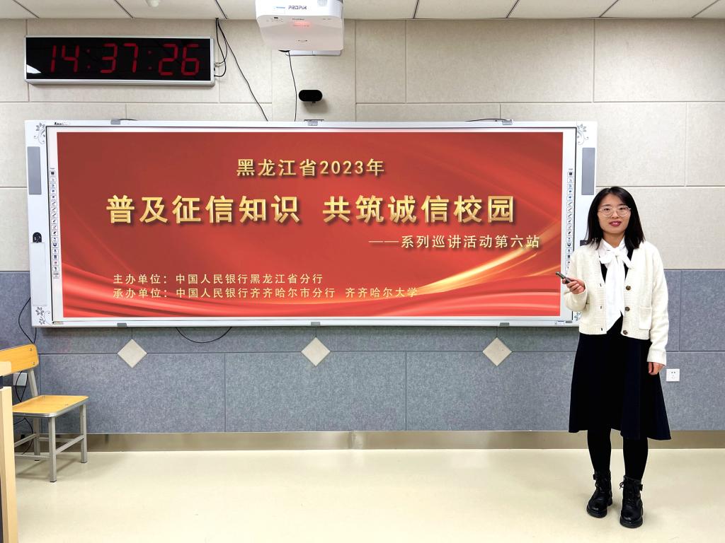 为进一步提升sunbet申搏师生征信与信用意识,强化守信观和价值观教育,在中国人民银行黑龙江省分行的指导下,11月10日,sunbet申搏与中国人民银行齐齐哈尔市分行共同承办的2023年黑龙江省“普及征信知识 共筑诚信校园”系列巡讲第六站活动在养正楼408智慧教室举行。