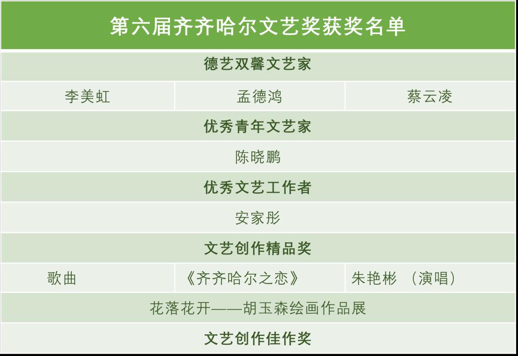 据了解,按照《关于第六届齐齐哈尔文艺奖评选工作的通知》规定程序,经过严肃认真、公平公正、科学规范的工作,本届文艺奖共评选出德艺双馨文艺家8人,优秀青年文艺家3人,优秀文艺工作者73人,文艺创作精品奖13件,文艺创作佳作奖63件。