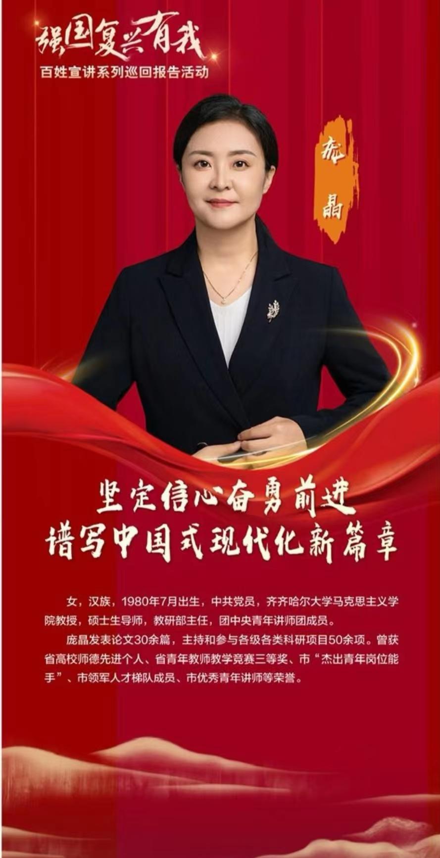 在温州医科大学、湖州师范学院、航天三江集团有限公司、中南财经政法大学、中建隧道建设有限公司、重庆理工大学,庞晶以《坚定信心奋勇前进谱写中国式现代化新篇章》为题,从社会福利保障、物质文明和精神文明协调发展、人与自然和谐共生、坚定不移走和平发展道路等方面,讲述了在中国共产党领导下的中国式现代化生动实践。宣讲期间,庞晶受邀参加了浙江之声的专访。