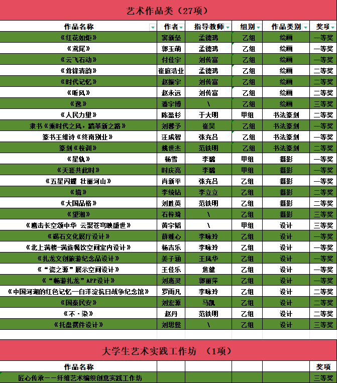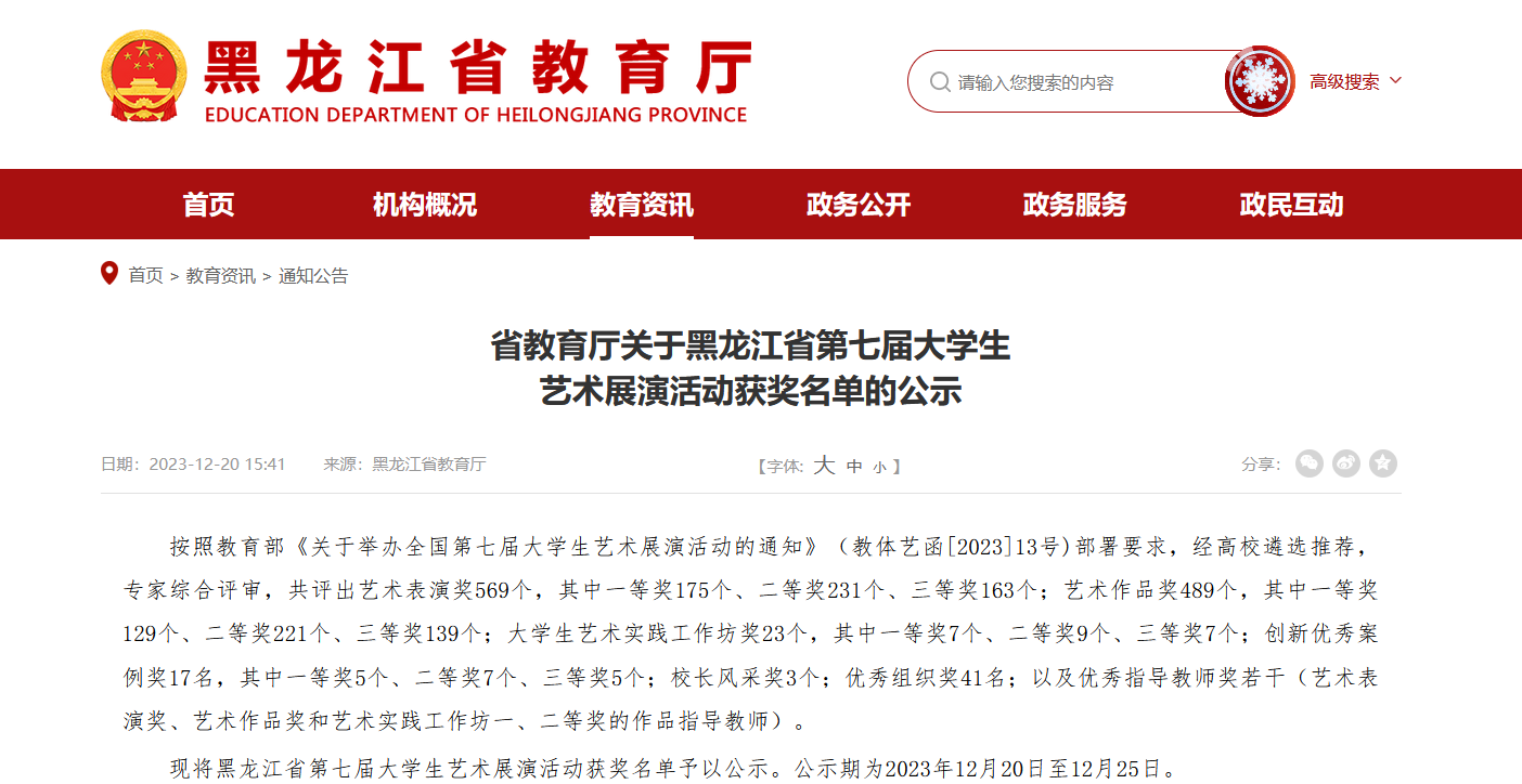 近日,由黑龙江省教育厅主办的全省第七届大学生艺术展演活动评选结果揭晓。sunbet申搏参赛项目成绩优异,共上报参赛作品68项,获奖63项,其中一等奖29项,二等奖25项、三等奖9项,获奖数量、层次均有新突破,是sunbet申搏文化育人实践成果的生动体现。