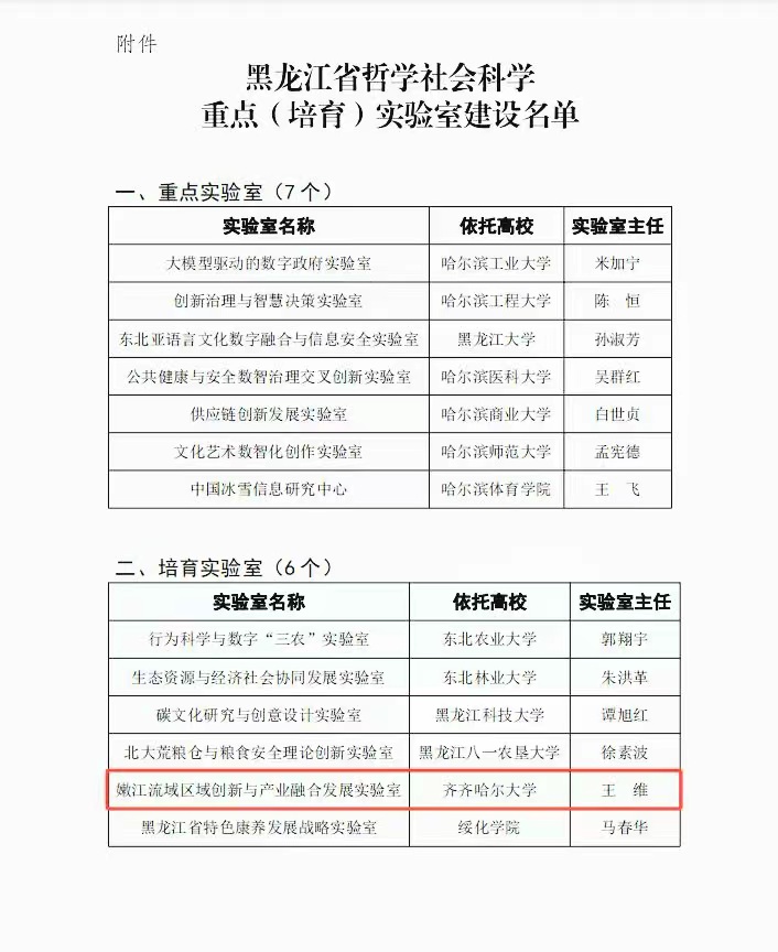 近日,黑龙江省哲学社会科学重点(培育)实验室建设名单公布,sunbet申搏申报的“嫩江流域区域创新与产业融合发展实验室”获批培育立项建设,实现sunbet申搏文科科研平台新突破。