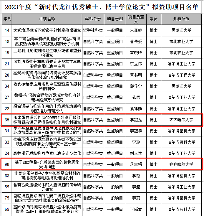 黑龙江省教育厅自2022年开始设立“新时代龙江优秀硕士、博士学位论文”资助项目,遵循“科学公正、注重创新、聚焦应用、服务龙江”的原则,每年从在我省就业创业的应届硕士、博士毕业生学位论文中遴选100篇优秀论文立项资助,旨在为充分激发青年人才学术研究和创新创造活力,吸纳更多高校应届毕业生扎根龙江、贡献龙江,为现代化新龙江建设提供科技创新源泉和人才技术储备。