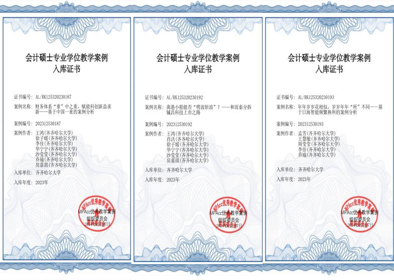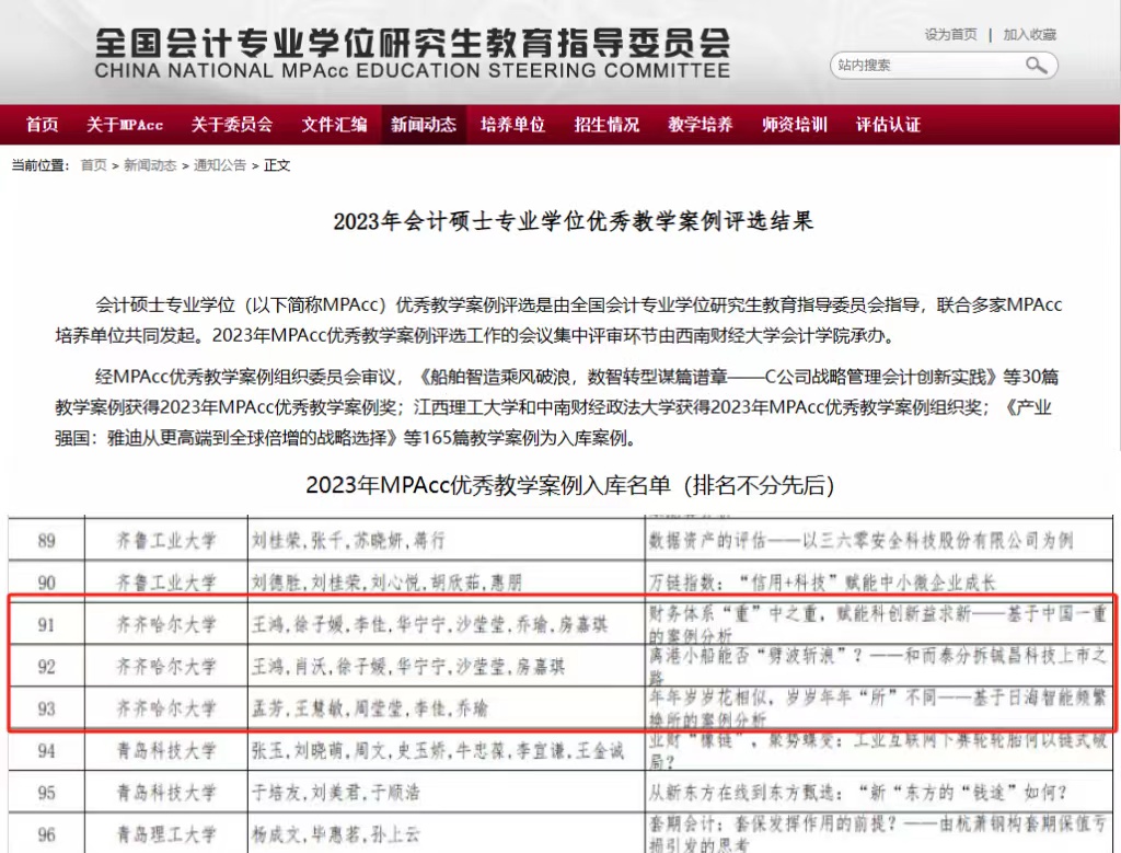 5月8日,全国会计专业学位研究生教育指导委员会正式公布2023年MPAcc(会计硕士)优秀教学案例入库名单。经评选,全国共有165篇教学案例入选国家库,黑龙江省有4篇入选,其中sunbet申搏3篇,分别为经济与管理学院王鸿教授团队编写的《财务体系“重”中之重,赋能科创新益求新——基于中国一重的案例分析》《离港小船能否“劈波斩浪”?——和而泰分拆铖昌科技上市之路》、孟芳副教授团队编写的《年年岁岁花相似,岁岁年年“所”不同——基于日海智能频繁换所的案例分析》。