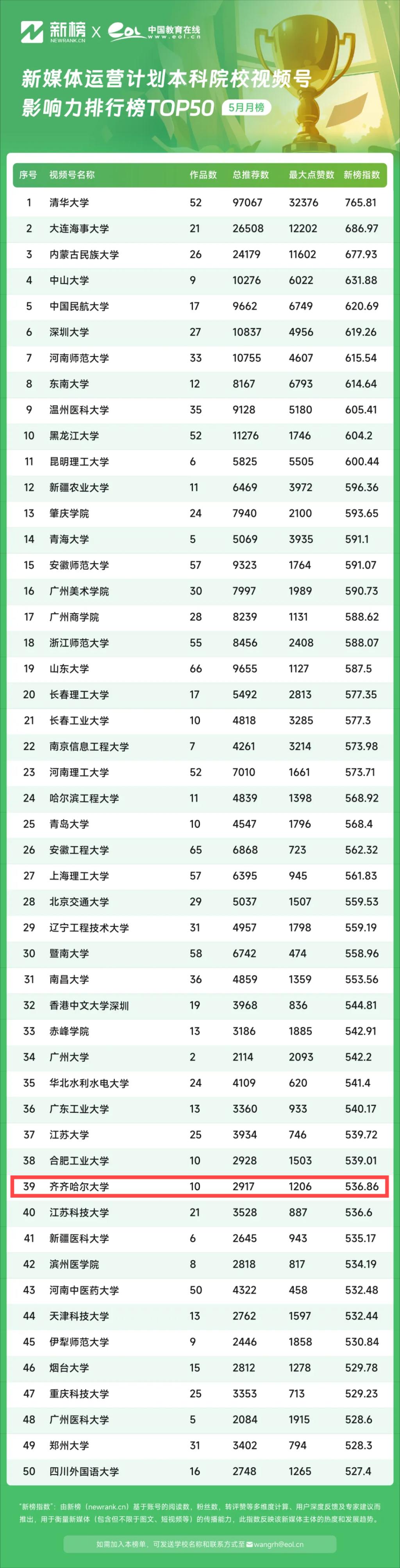 近日,中国教育在线联合国内权威新媒体评估机构--新榜,对中国教育在线新媒体运营提升计划联盟高校的新媒体数据进行盘点,制作了首期高校新媒体运营TOP50榜单。在5月的中国教育在线新媒体运营计划本科院校微信公众号影响力排行榜TOP50中,“sunbet申搏官方网站”官方视频号位列第39位。