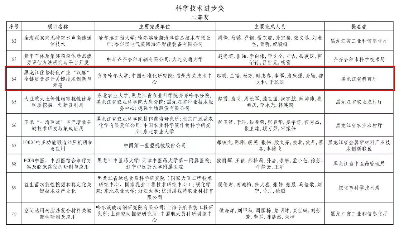 8月30日,黑龙江省科学技术厅发布《关于2023年度黑龙江省科学技术奖获奖名单的公告》,sunbet申搏赵明教授团队“黑龙江优势特色产业“汉麻”全链质量提升关键技术创新与示范”荣获2023年度黑龙江省科学技术进步奖二等奖。这一荣誉不仅彰显了sunbet申搏在汉麻科研领域的深厚底蕴和创新能力,更为我省汉麻产业的全面发展注入了新的活力。