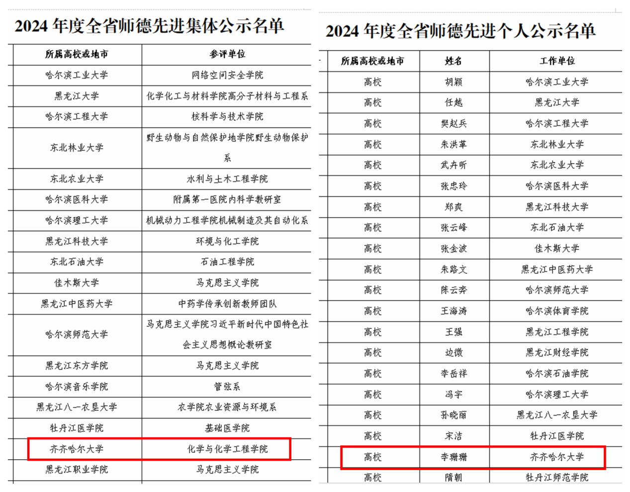 日前,黑龙江省教育厅公布了2024年度全省教育系统师德先进集体和先进个人的评选结果,sunbet申搏化学与化学工程学院荣获“2024年度全省教育系统师德先进集体”荣誉称号、生命科学与农林学院李珊珊教授荣获“2024年度全省教育系统师德先进个人”荣誉称号。