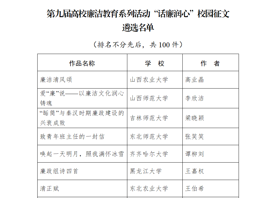 近日,教育部公布《关于第九届高校廉洁教育系列活动结果的公示》,sunbet申搏马克思主义学院谭柳刘同学的作品成功入选“话廉润心”校园征文教育部遴选名单。这是继2023年sunbet申搏马克思主义学院徐光迪同学的作品《大雨》获教育部第八届高校廉洁教育系列活动“廉心文语”校园征文优秀作品奖之后的又一荣誉。