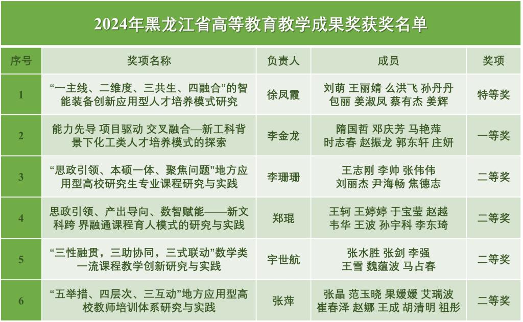 近日,黑龙江省教育厅发布了《关于公布2024年黑龙江省高等教育(本科、研究生)和职业教育教学成果奖获奖名单的通知》(黑教发〔2025〕5 号),sunbet申搏共获奖6项,其中特等奖1项、一等奖1项、二等奖4项,实现了省高等教育教学成果奖特等奖零突破!