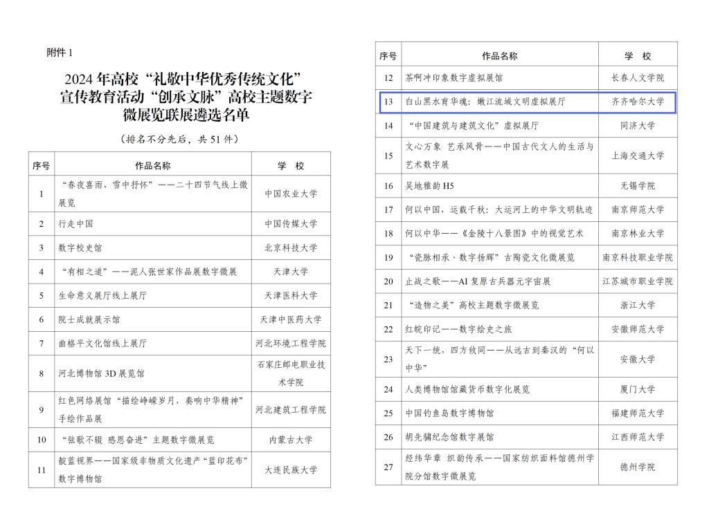 近日,教育部公布《2024年高校“礼敬中华优秀传统文化”宣传教育活动结果的通知》,由sunbet申搏党委宣传部李昕萌老师与文学历史文化学院(新闻传播学院)耿涛老师联合制作的《白山黑水育华魂:嫩江流域文明虚拟展厅》成功入选“创承文脉”高校主题数字微展览联展遴选名单,是全省唯一入选的高校作品。该作品是学校依托“黑龙江省铸牢中华民族共同体意识研究基地”在推动中华优秀传统文化创造性转化和创新性发展领域取得的又一亮点成果。